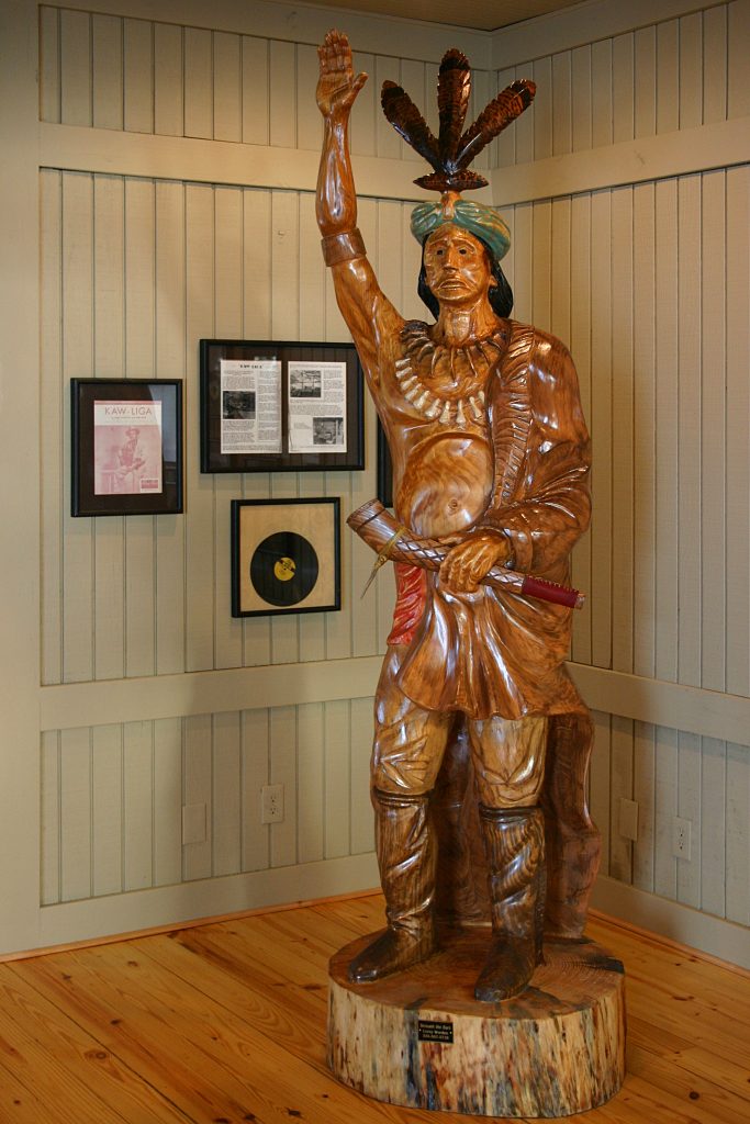 “Kaw-liga IV,” who now greets guests with poise and stature, was created by wood carver and artist, Cory Worden of Beneath the Bark. The original Kowaliga wooden Indian—the one made famous in the Hank Williams song—according to local businessman Fred Dobbs, came from an Alexander City Pontiac dealership. It was kidnapped long ago, never to be seen again. His successor, who was found at a Sylacauga Pontiac dealership, was also spirited away without a trace. One might imagine that some thought was given to Kaw-liga’s obvious portability when the third, concrete statue was created. Although he managed to not be abducted, he suffered many assaults over the years, including fire and vandals.